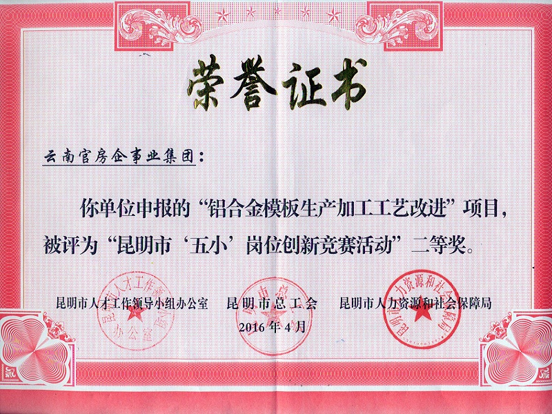 ? ?? ? ??7月6日,由官房邁騰申報的“鋁合金模板生產加工工藝改進”項目榮獲“昆明市‘五小’崗位創新競賽活動”二等獎。此次評比由昆明市人才工作領導小組辦公室、昆明市總工會、昆明市人力資源和社會保障局共同舉辦。云南官房邁騰有限公司鋁模板事業部主要承擔公司鋁模板、電控箱柜以及冷作產品的生產制作工作,于2013年10月開始鋁模板的生產制作工作。在生產過程中,公司克服了產品工藝不成熟等實際困難,分別從下料、沖孔、銑口以及焊接方面對工藝加以改進。通過對模板生產加工工藝中存在的問題進行改進,大大提高了生產效率和產品質量,現公司模板月生產量已達到并突破10000平米,成為云南省目前最大的模板生產制作企業之一。